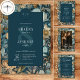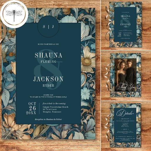 Indulge in the enchantment of the past with our vintage floral wedding invitations. Inspired by the iconic designs of William Morris, these invitations feature a mesmerising blend of vintage hues - deep teal blues, soft tans, golds, and creams. The intricate floral patterns, reminiscent of the Art Nouveau era, exude a touch of darkness, adding a mysterious allure to your special day. The dark teal text area, adorned with elegant vintage script, provides a striking contrast against the rich floral backdrop. This timeless design captures the essence of classic romance, making it the perfect choice for couples seeking a truly unique and unforgettable invitation. Created by Simply Farmhouse Press.