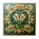 Art Nouveau White Flowers, Blue-Green Background Tile
