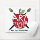 A mousepad for art teachers featuring an illustration of a red apple with painted text "ART TEACHER" in white. Two brushes crossed behind the apple. One paintbrush with red and white paint, one with green. Personalise with your name at bottom in black.