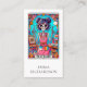 A lush fun art teacher business card in a tarot card style, with a painted skeleton in a colourful art studio.