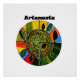 An abstract design centred around a leaf and stem motif with circular patterns.