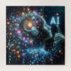 Conceptual illustration of Artificial Intelligence with human figure pointing to AI lettering. Cascading binary code background. Futuristic art related to the AI.