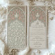 This artisan wedding invitation blends the intricate beauty of Islamic lace with a unique coral and sage colour palette, creating a piece that's both culturally rich and visually captivating. The lace pattern features a harmonious blend of florals and geometric shapes, evoking the ornate carvings found in historic mosques. The coral adds a warm, romantic touch, while the sage offers a natural, calming counterpoint, together producing an inviting, elegant look. This invitation is perfect for the couple who desires a marriage of tradition and modernity and wishes to make a statement with their wedding stationery.