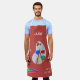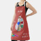 Artist at work Apron, in an all over design. The apron is a shade of red with a pallet, brushes, pastels, and paints. It also has the words, "Quiet, Artist at Work", and a name that can be changed. Thanks to the Hungryjpeg and Creative Fabrica for some of the elements in the design.