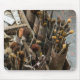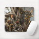 A mousepad with a photo of a set of a variety of artist paint brushes and old paints sittng in an old wooden case. Everything looks dirty, messy and well used with lots of different sized brushes, various artist tools and rags.