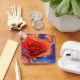 Artistic keychain features AI generated digital abstract marbled red and orange rose in full bloom on blue background.