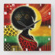 A striking wall clock displaying a bold African-inspired design, showcasing vivid patterns and colours contrasted with a silhouette image in silhouette, combining functionality with artistic flair.