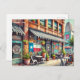 The painting beautifully illustrates the storefront of a small, charming coffeeshop in a bustling Houston neighbourhood. The cafe features a brick facade with large, inviting windows, adorned with a colourful mural celebrating Texan culture. Potted plants and hanging greenery frame the entrance, while a striped awning shades the outdoor seating area. Wooden tables and metal chairs create a cosy spot for patrons to enjoy their coffee while watching the world go by. A chalkboard sign on the sidewalk lists the day’s specials, adding a welcoming touch. In the background, pedestrians stroll past, and a faint glimpse of Houston’s skyline provides a connection to the city’s urban vibrance.