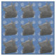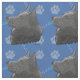 An artistic sketch style rendition of the head of a Schipperke dog against a blue background with paw prints and tracks in grey, pink and blue.