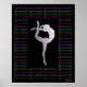 Gymnastics poster with the word, "gymnastics" written over and over in different colours. The word art is in the shape of a frame, surrounding a beautiful silver gymnast in a pose.