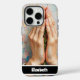 Creative phone case design featuring a textured artistic illustration of hands in a prayer pose, personalised nameplate, vibrant colours, perfect for unique expression and gifting.