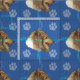 An artistic sketch of the head of a happy Rough Collie with a blue background decorated with paw prints and tracks in shades of grey, pink and blue. Design by Diane Blackman. The same design is available with other fun dog images.