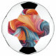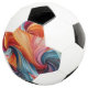 A uniquely designed soccer ball featuring a swirling pattern of vibrant colours on one panel, contrasted with traditional black and white patches.