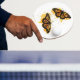 The design features two vibrant monarch butterflies in mid-flight, rendered with artistic paint splatters in warm shades of orange and yellow. This nature-inspired graphic captures the delicate elegance of spring wildlife. It makes a wonderful gift for gardeners, entomology enthusiasts, nature lovers, or anyone who appreciates the symbolism of freedom and change.