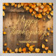 This customisable Thanksgiving poster features a rustic wooden background, reminiscent of an aged barn door, adorned with a scattering of vibrant autumn leaves in shades of orange, yellow, and brown. The warm, seasonal colours create a cosy and inviting atmosphere, perfect for celebrating the holiday.