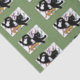 A black and white cat is lying across paper, paint, paint pallet, oozing paint, and pencils with their favourite mouse on canvas paper in a backdrop of green