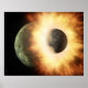 Artist's concept of a celestial body colliding into a planet sized body featured with explosion.