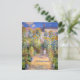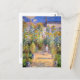 A fine art postcard with the impressionist landscape painting, The Artist's Garden at Vetheuil (1881) by Claude Monet (1840-1926). A path through the garden in late summer where the flowers are blooming with large yellow sunflowers and hollyhocks.