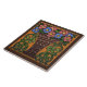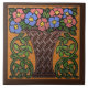 Custom Designed, custom made ceramic tile depicts a colourful Petunia bouquet in a wicker basket w/ supporting green vines against a faux honey-maple wood background and chocolate brown border.