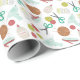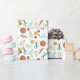 Wrapping paper featuring an arts and crafts themed pattern with illustrations of a ball of yarn with knitting needles, ribbon, hot glue gun, glitter, glue, buttons, and scissors.