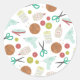 A sticker featuring an arts and crafts themed pattern . Design consists of a ball of yarn with knitting needles, buttons, scissors, a bottle of glitter, a bottle of glue, ribbon, and a hot glue gun. Design has a retro orange, yellow, red, and blue / turquoise colour scheme.