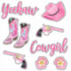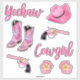 Be a country cowgirl with this fun and playful design! It features a hand-drawn and hand-painted neon pink, bubblegum pink, mint green, and black watercolor cowgirl illustration pattern. These elements include cowboy hats cowgirl boots, revolver, and sheriff's badge on top of a pretty pink watercolor background. This sticker pack also include neon pink typography quotes of, "yeehaw," and, "cowgirl." It's cool, unique, and trendy!