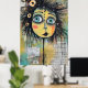 A colourful and whimsical character with exaggerated, large eyes and a crown of flowers and butterflies gazes out from the frame. The background is a collage of various texts and symbols suggesting a fusion of different cultures and ideas.