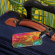 This luggage tag has an artsy design on it.