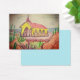 A watercolour pencil sketch and painting of the Alto Vista Chapel in Aruba with Caribbean Sea and various cacti, rocks and thorny shrubs.