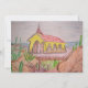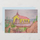 A watercolour pencil sketch and painting of the Alto Vista Chapel in Aruba with Caribbean Sea and various cacti, rocks and thorny shrubs.