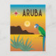 Aruba bright colourful illustration with a rocky beach, sun, aloe plants, a brown throated parakeet and the four pointed star from the flag of Aruba. The name is in a vintage deco font. Celebrate memories of your island vacation travel or Caribbean cruise.