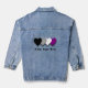 enim Jacket with hearts design in colours of asexuality; black, grey, white and purple, stripes pride flag, rainbow love design, with customisable text