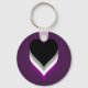 Basic Button Keychain with hearts design in colours of asexuality; pink, yellow and blue stripes pride flag, rainbow love design, on purple background