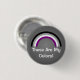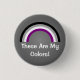 Round Button with asexuality rainbow stripes of black, grey, white and purple; ace pride flag design on grey background, "These Are My Colours" template text, by pinkbrickroad