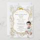 Baby boy in white suit. Invitation background is white satin, gold filigree, a gold and silver glitter frame and bow embellishment. Back is adorned with gold flower pattern & gold ribbon on a white satin background.