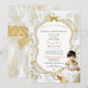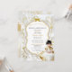 Baby girl in white & gold dress. Invitation background is white satin, gold filigree, a gold and silver glitter frame and bow embellishment. Back is adorned with gold flower pattern & gold ribbon on a white satin background.