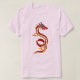 A pink t-shirt with a red and yellow dragon design on the front. The dragon is coiled in an S-shape, with flames coming out of its body. The dragon has a red head with black horns and a yellow outline. The t-shirt is plain and simple, with a crew neck and short sleeves. The background is a light pink colour.