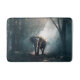 A bath mat with a photograph of an Asian elephant with rounded ears standing in a forest clearing looking towards the viewer with sunlight streaming down through the canopy of trees.