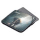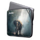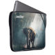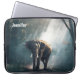 A laptop sleeve with a photograph of an Asian elephant with rounded ears standing in a forest clearing looking towards the viewer with sunlight streaming down through the canopy of trees.