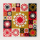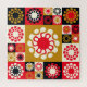 Asian-inspired ethnic mosaic with stylised flowers in gold, red, and ivory.
