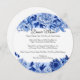 DINNER MENU with light sky blue background with royal, navy and light blue floral version with a Round format. A bird sits on a branch among the garden flowers. Design created by artist, Audrey Jeanne Roberts. Copyright. Hand painted watercolor Blue Asian Influence Floral Chinoiserie design has a complete collection available here (copy and paste link into browser): https://bit.ly/2DS0gN6