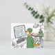 Funny medical cartoon card. An Asian surgeon is about to conduct an operation in an operating theatre and is checking the instructions online via a computer screen. Medical humour.