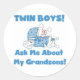 Two baby bunnies in baseball caps, a blue polka dot bassinet, a heart that reads "It's 2 Boys!" and blue text that reads "Twin Boys! Ask Me About My Grandsons!" is featured on these proud new grandparent of twin boys T-shirts ,mugs, mousepads, buttons, magnets, stickers, tote bags, keychains, and other items.