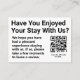 Have you enjoyed your stay with us? Encourage customers to leave a review. Message reads: "We hope you have had a pleasant experience staying with us. If so, please take a few moments to leave a review". Change wording to suit your requirements. Change the QR Code link to the link leading to your own reviews page. If Google, advice is given here: https://tinyurl.com/5ydtb22k