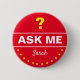 Buttons: Ask ME - ask your questions ? Red button with personalized text / person's name. Help desk assistant, info point clothing button.