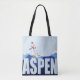 Fun Aspen Colorado themed all over print tote bag done in blue with graphics of snow covered mountains, a snowman skiing, and graphic text reading ASPEN. Customise to add more text to this great travel or all purpose tote bag.