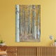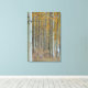 A dense grove of aspen trees fills the frame, their smooth, white bark contrasting sharply with the vibrant yellow leaves that still cling to the branches. The trees stand tall and slender, creating a sense of depth and perspective. The ground is covered in a layer of fallen leaves and dry grass, adding a touch of warmth to the scene.