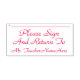 This respectable rubber stamp design features the message "Please Sign And Return To", along with a line for a signature or initials to be written above. It also features a customised teacher’s name. It could perhaps be used by a teacher, educator or tutor to ask a student’s parent(s) or guardian(s) to look over the student’s work on a project, an exam, a paper, or some other school assignment.