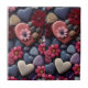This captivating mosaic features an intricate arrangement of heart-shaped objects and vibrant flowers against a dark background. The hearts vary in size, texture, and colour, ranging from deep red to soft beige. Scattered among them are colourful flowers with delicate petals, adding a touch of nature’s beauty. Perfect for celebrating love, anniversaries, or special occasions like Valentine’s Day.