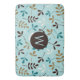 Illustrative surface pattern design of assorted leaf silhouettes in teal, cream, gold and brown on a light teal background with initial centre in light teal on brown to personalise.